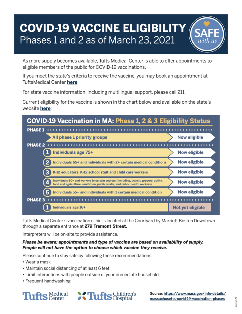 Tufts Medical Center COVID-19 Vaccine Update from 3/29guestApr 1, 20211 min readUpdated: Jul 9, 2025If you meet the state’s criteria to receive the vaccine, you may book an appointment at TuftsMedical Center here.